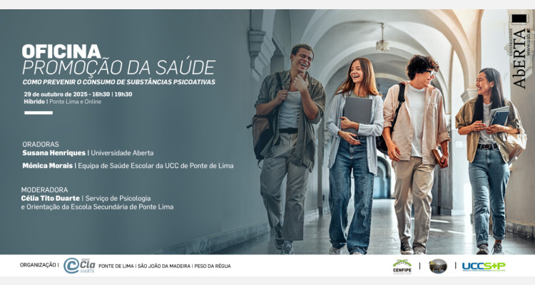 Promoção da Saúde: como prevenir o consumo de substâncias psicoativas é o tema da 2ª oficina que decorre no dia 29 de outubro, entre as 16h30 e as 19h30, online e presencialmente, no auditório da Escola Secundária de Ponte de Lima (evento híbrido).