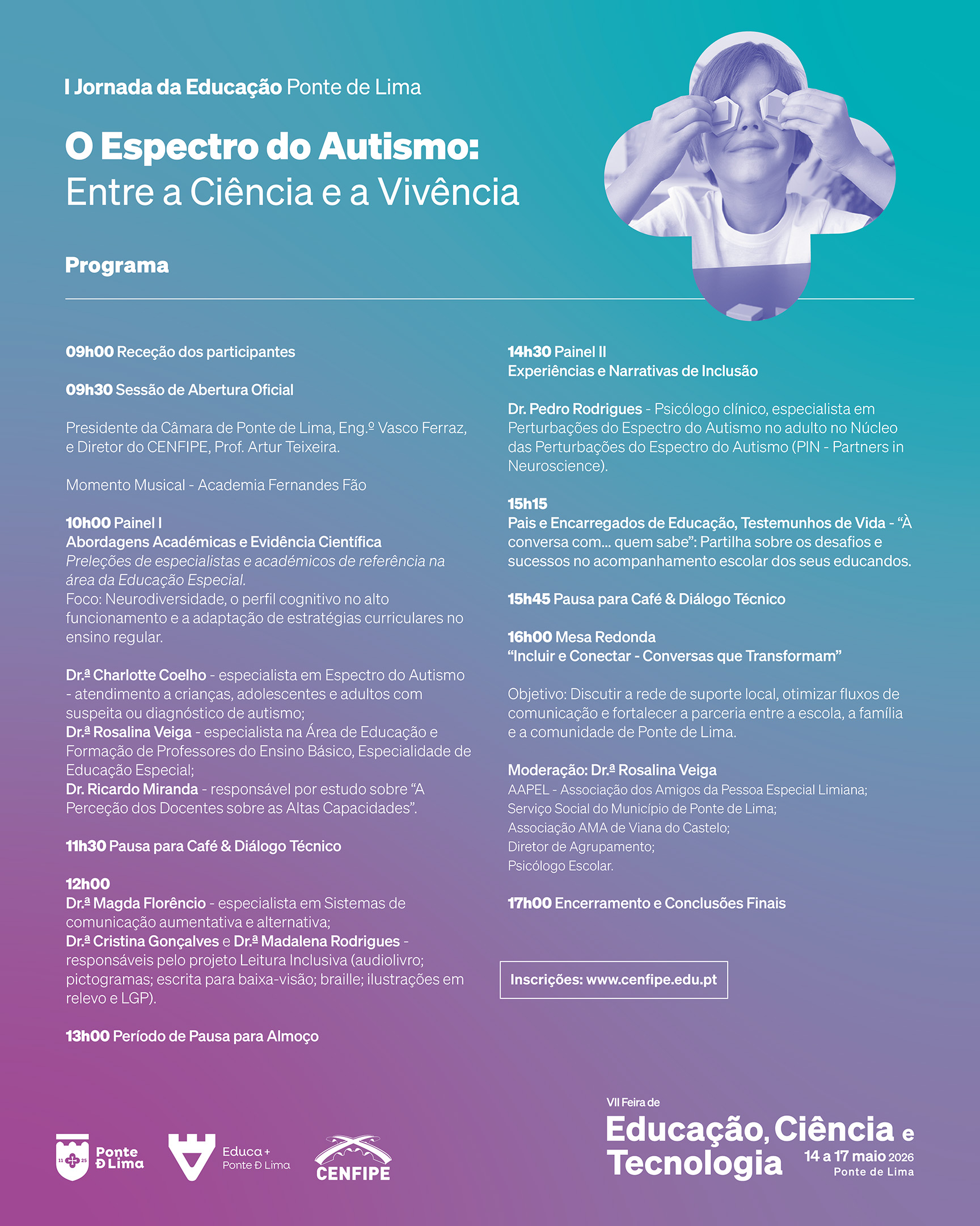 É com enorme entusiasmo que anunciamos, em estreita parceria com o Município de Ponte de Lima, a realização da I Jornada da Educação de Ponte de Lima, subordinada ao tema "O Espectro do Autismo: Entre a Ciência e a Vivência". Este evento surge como um espaço privilegiado de reflexão e partilha, inserido na VII Feira de Educação, Ciência e Tecnologia, procurando cruzar o rigor do conhecimento científico com a riqueza das experiências vividas no quotidiano escolar e familiar.